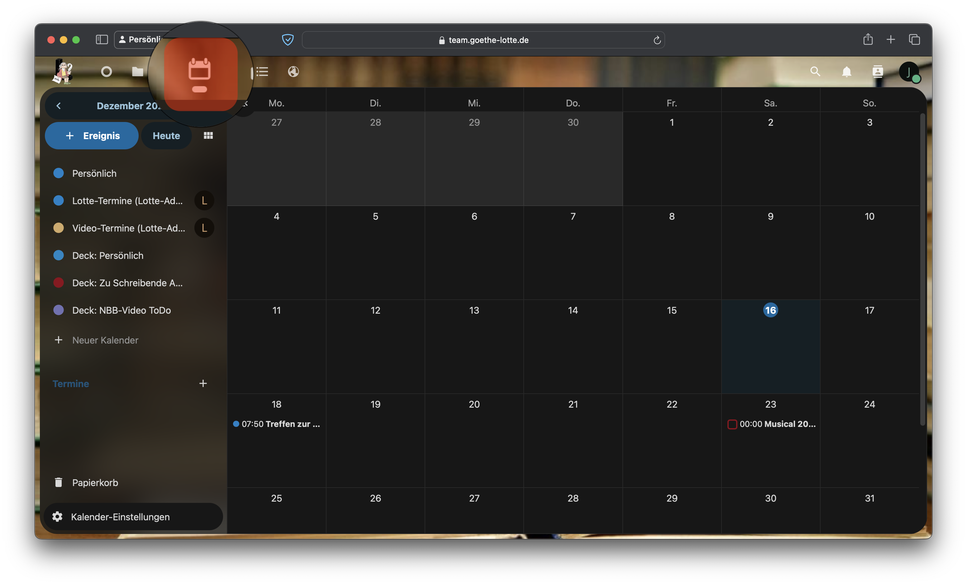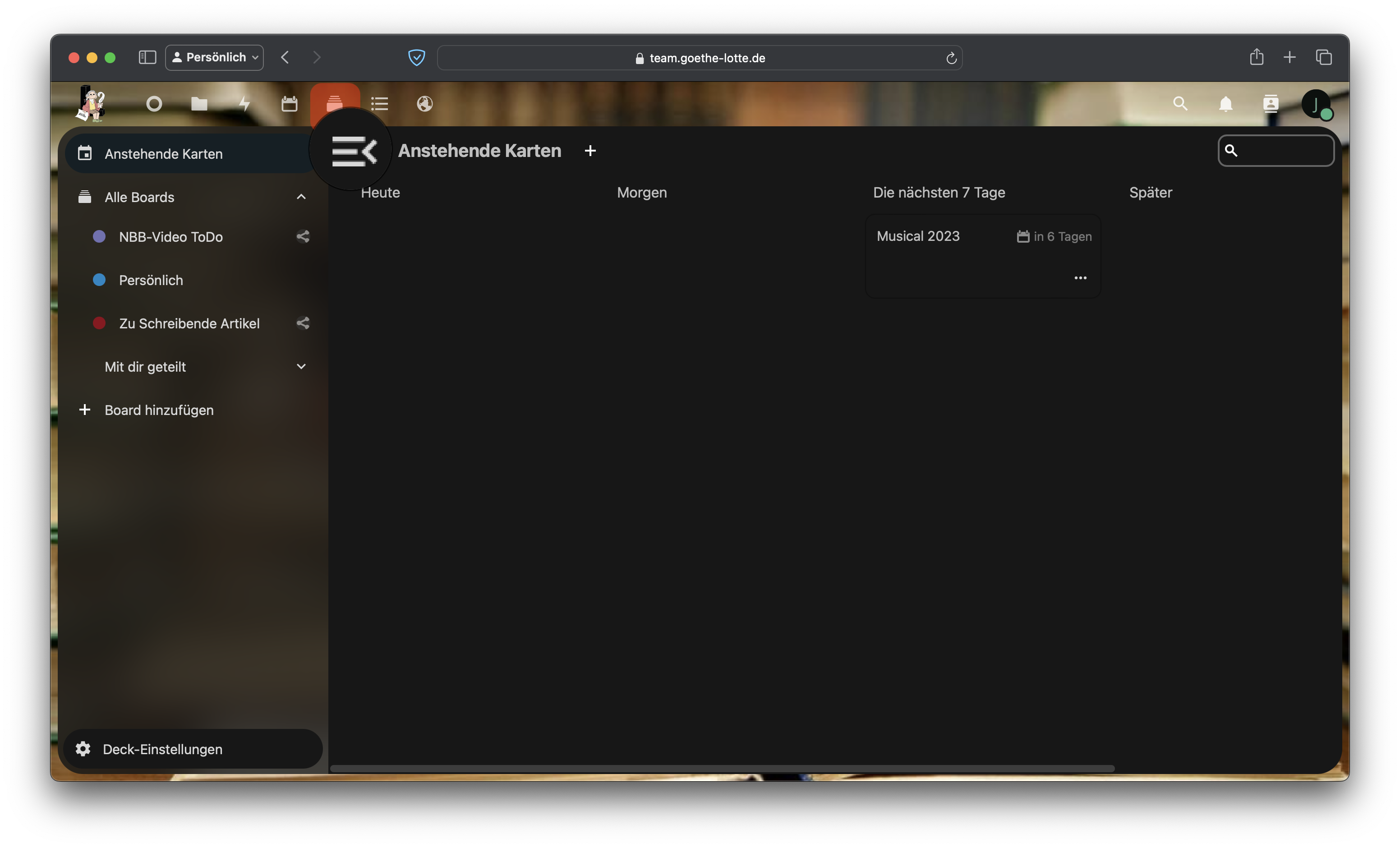 Das Deck ist der nächste Punkt. Deck-Tafeln mit Deadline werden zusätzlich im Kalender angezeigt. Dies gilt für alle Deck-Kalender