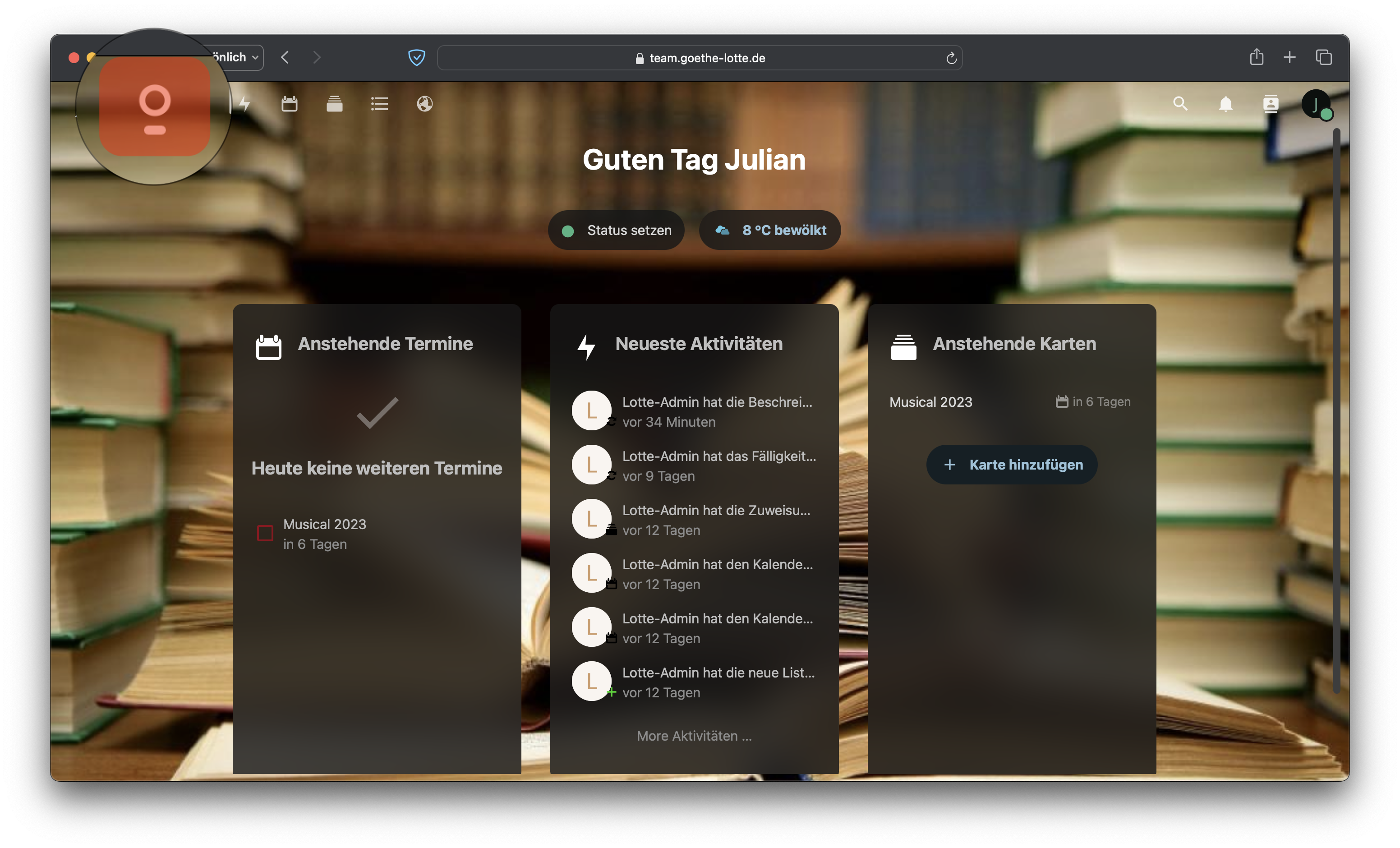 Hier kannst du aktuelle Infos sehen und deinen Status bearbeiten. Unten gibt es außerdem einen Anpassen-Button um die Module ein- und auszublenden. Jetzt gehen wir oben alle relevanten Tabs durch: