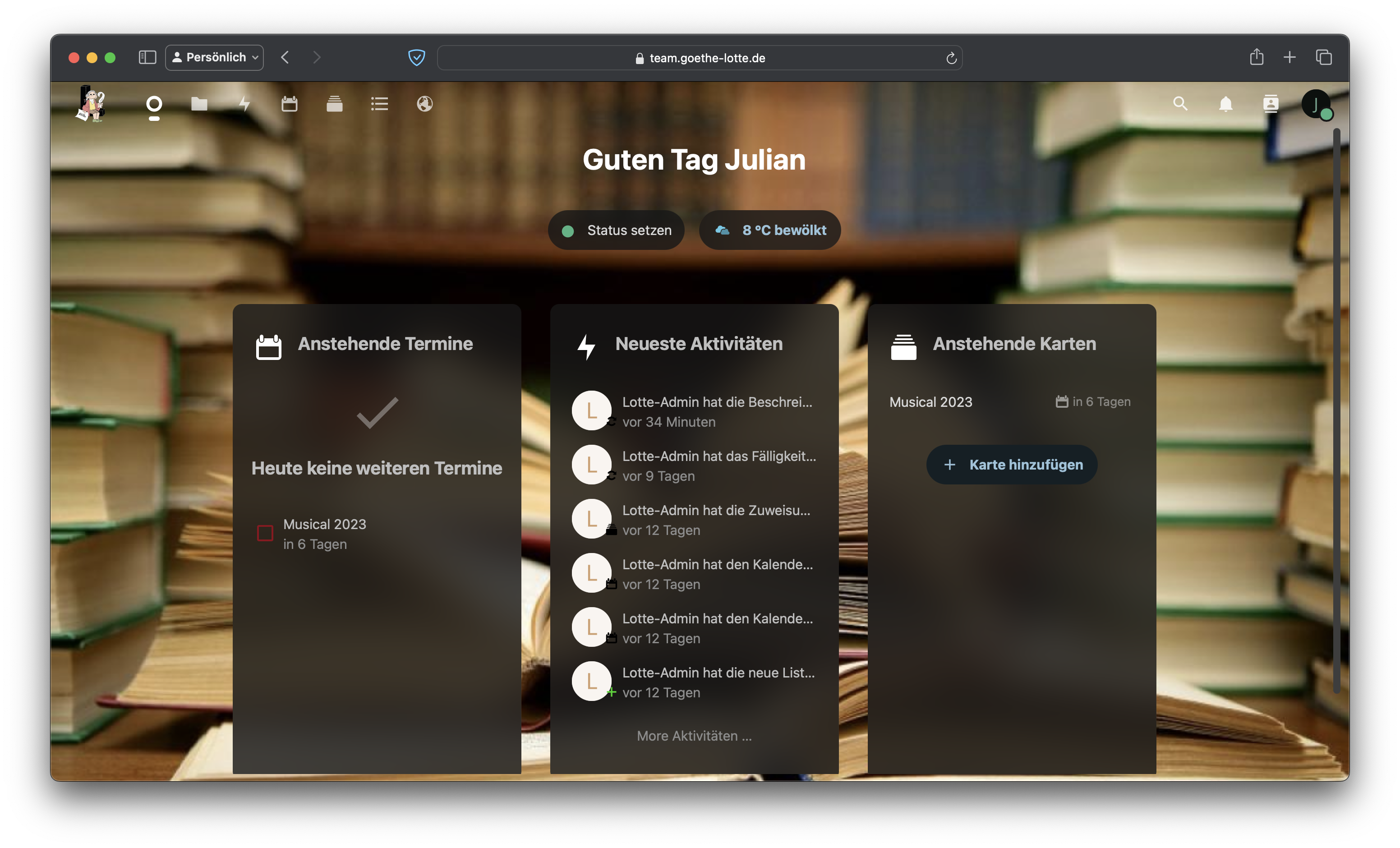Um dich in den Team-Bereich einzuloggen öffne in deinem Browser einfach die Seite team.goethe-lotte.de. Du kannst dies auch über dein Handy machen, allerdings ist die Seite für iPad und PC optimiert. Hier gibst du dann deine Anmeldedaten ein. Bedenke, dass du für WordPress und NextCloud verschiedene Passwörter verwenden kannst. Dies musst du nicht, kannst du aber. Daher können die Passwörter auf diesen beiden Seiten unterschiedlich sein. Sofern du dich richtig angemeldet hast, solltest du jetzt dein Dashboard sehen. Falls du Probleme hast, wende dich einfach an julian.schock@gghi.de.